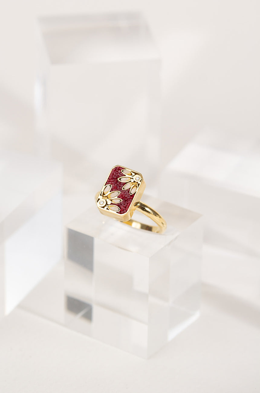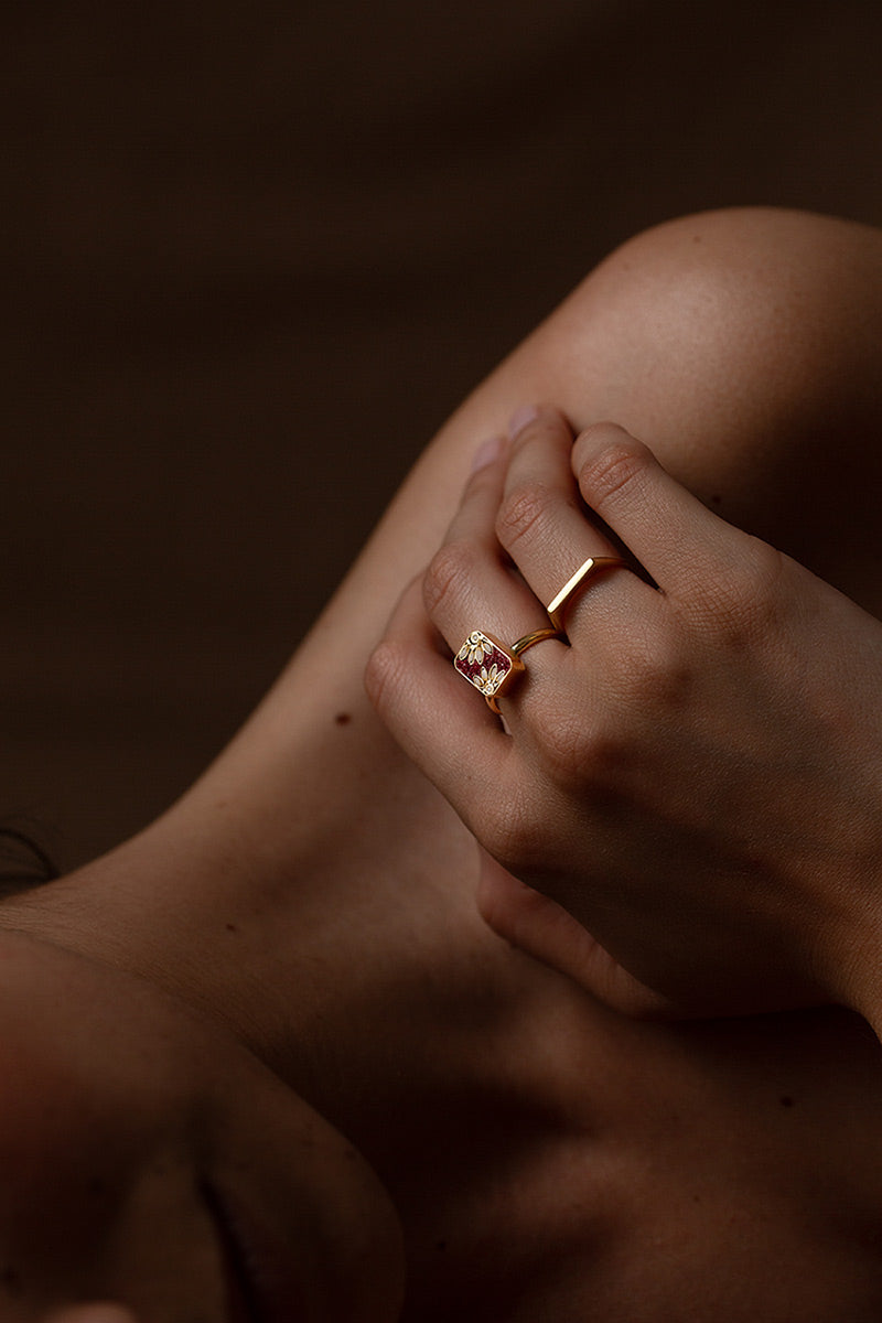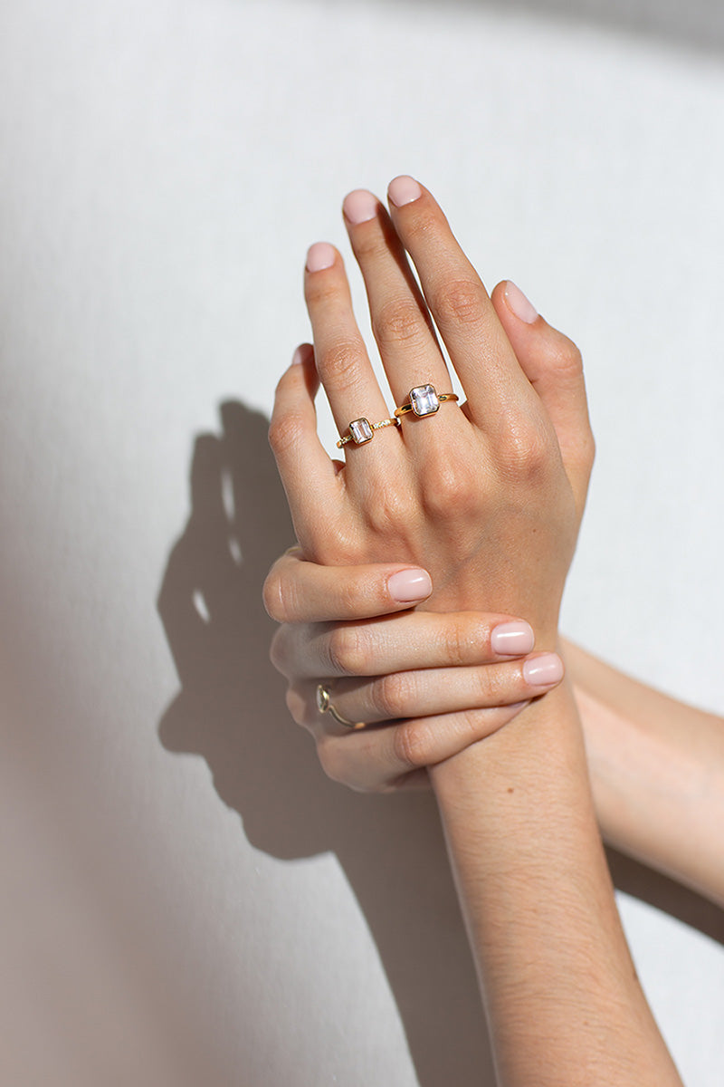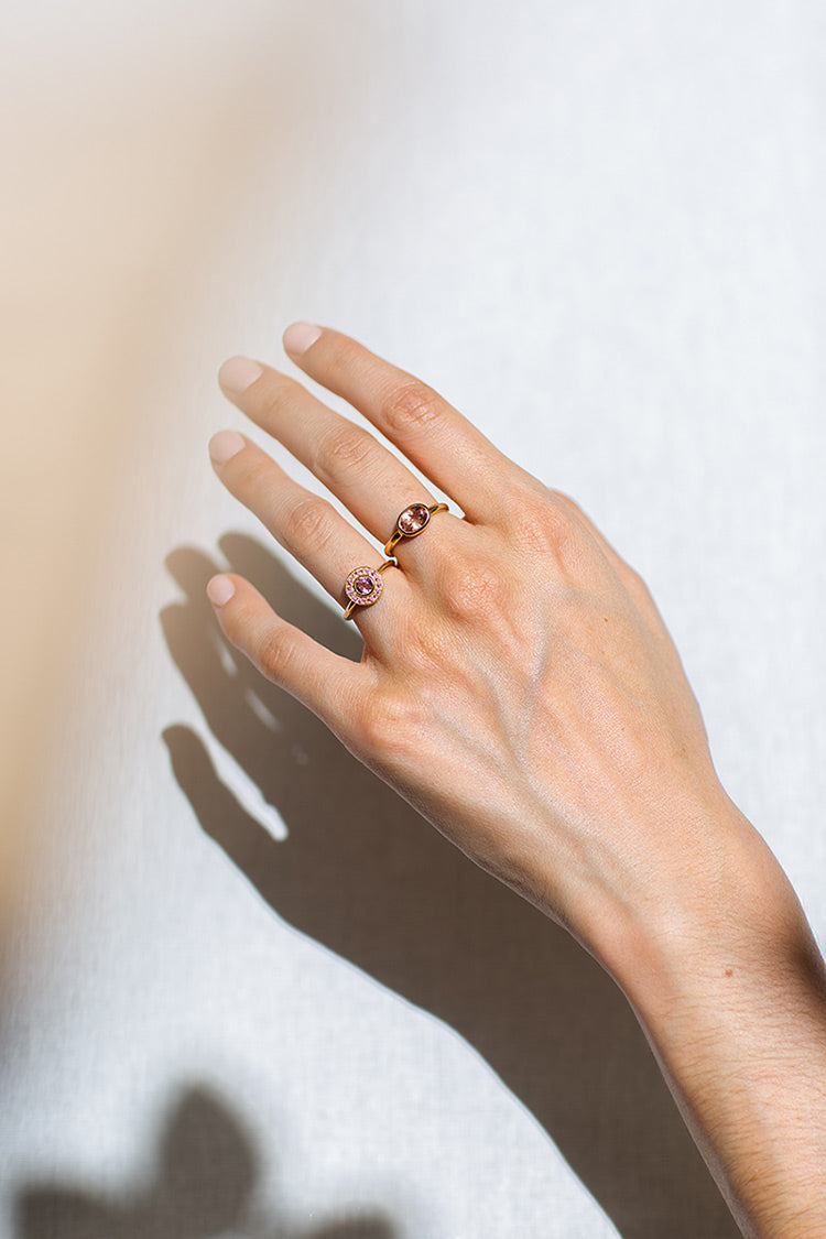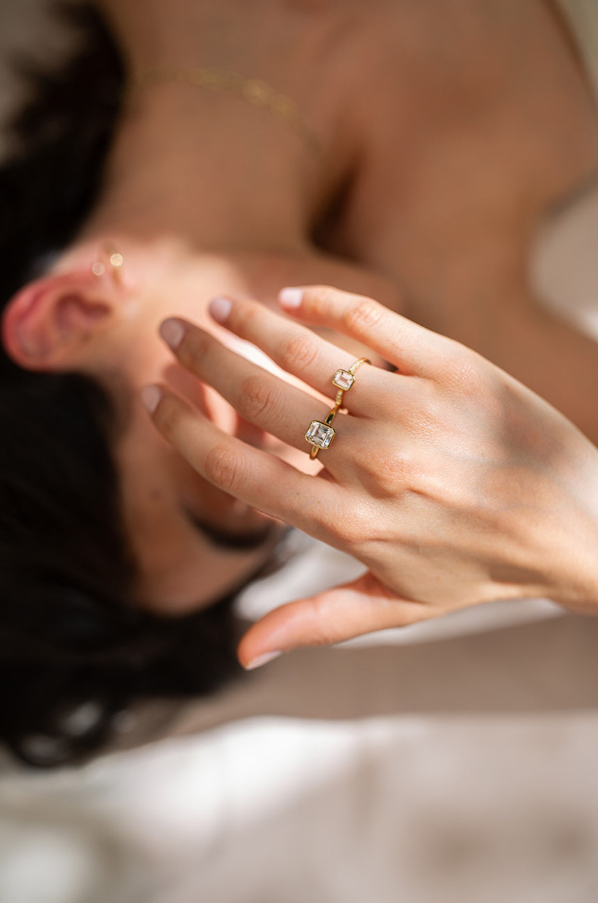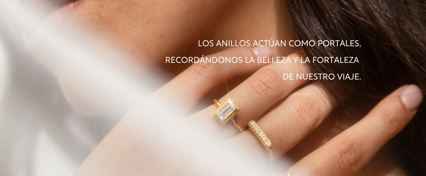 Cada anillo, cuidadosamente confeccionado, fusiona la delicadeza con la fortaleza, utilizando gemas provenientes de las profundidades de la tierra, para converstirse en joyas con destellos luminosos. Desde diamantes champagne hasta piezas inspiradas en las flores, la colección refleja una armoniosa unión entre lo terrenal y lo divino.