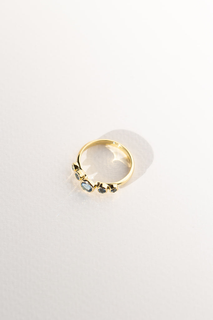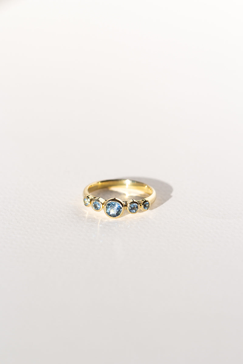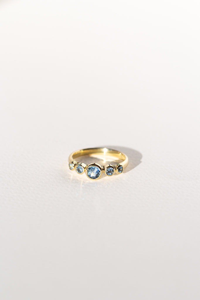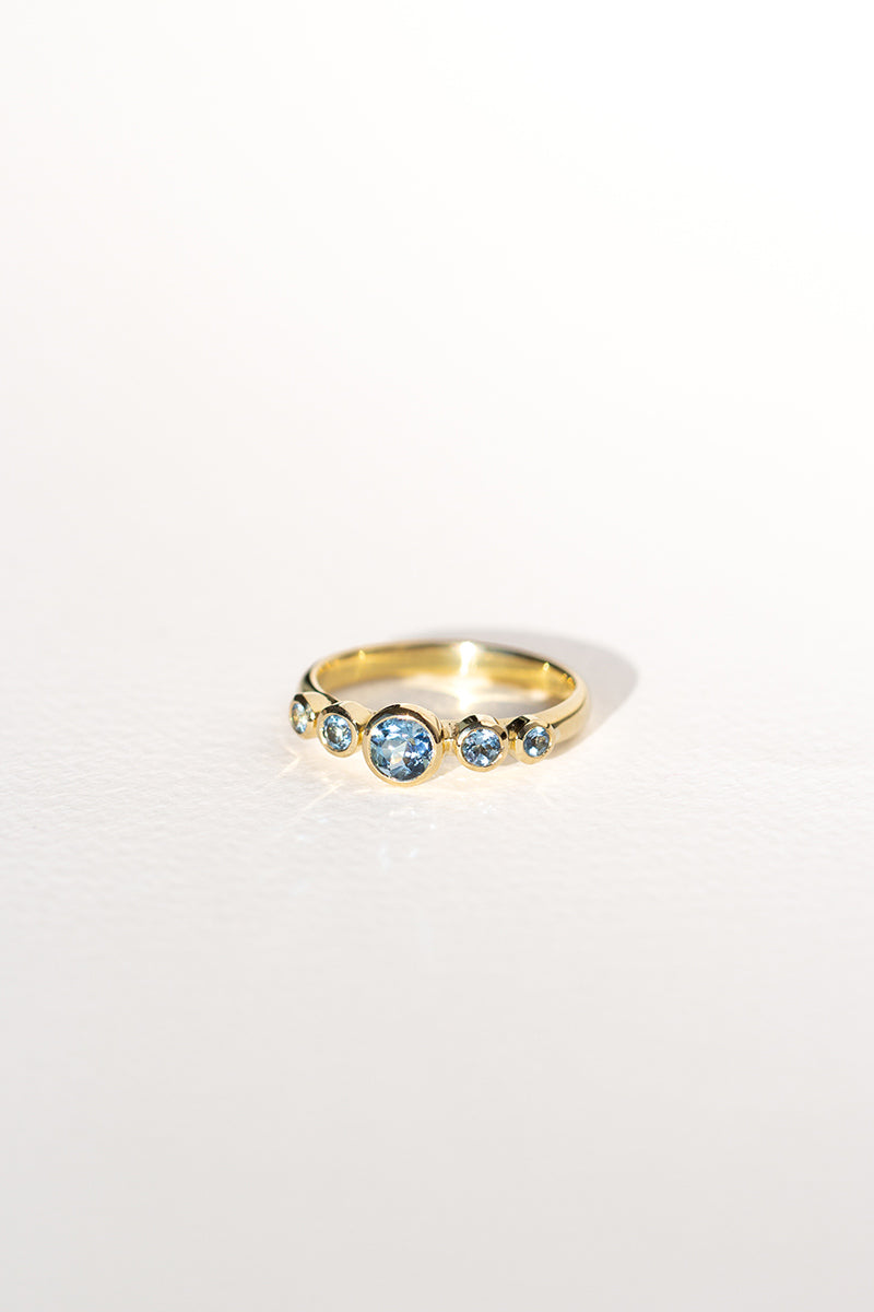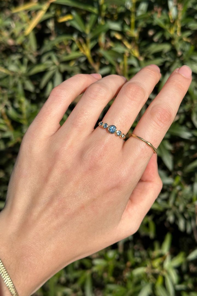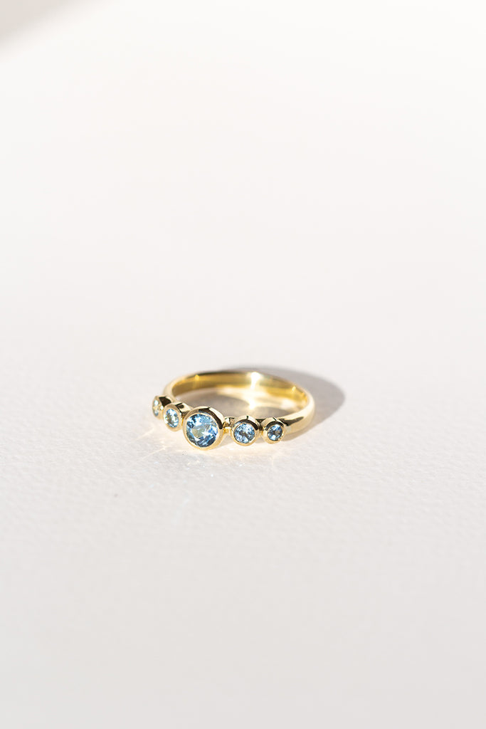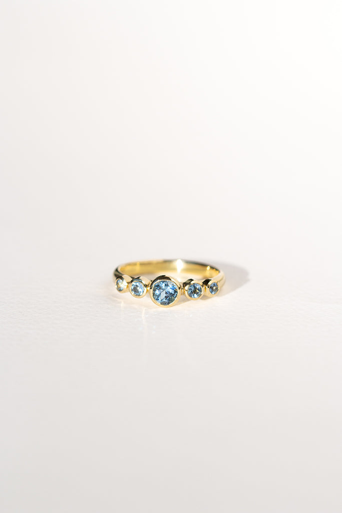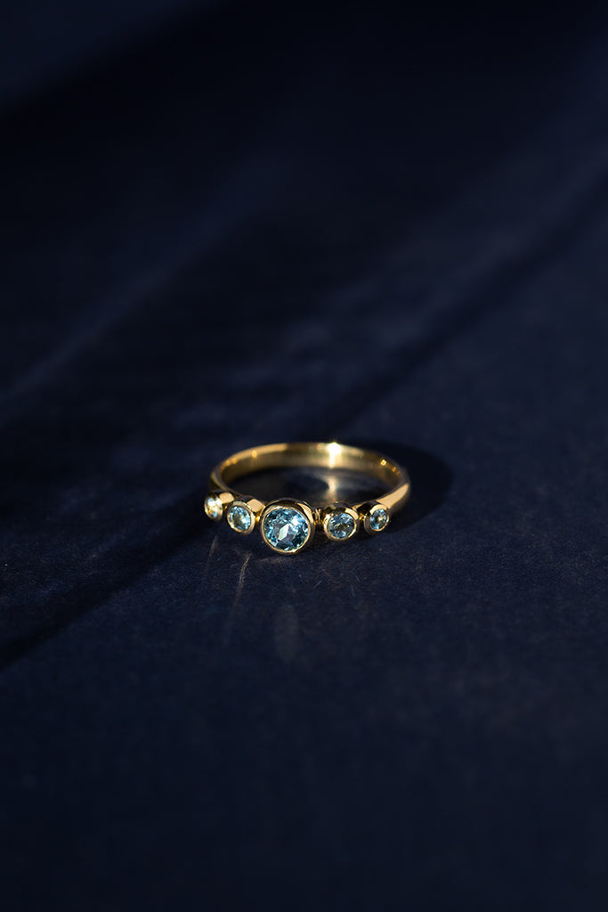 TALLA 13 en STOCK. Anillo tipo cintillo o quintillo, con aguamarinas calidad TOP. Aguamarina central 4 mm, total de 45 puntos en aguamarinas aprox. Confeccionado en oro amarillo 18K, peso aprox 3 - 3,5 gr dependiendo de la talla. Si tienes dudas con respecto a la talla visita la guía “Cómo medir tu talla” o escríbenos por whatsapp. Para confeccionarlo en otras tallas escríbenos por whatsapp. Este anillo se confecciona por bajo demanda, en nuestro taller en Santiago de Chile.