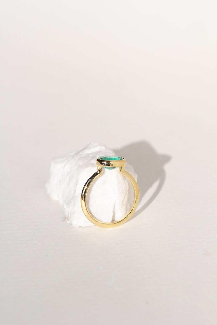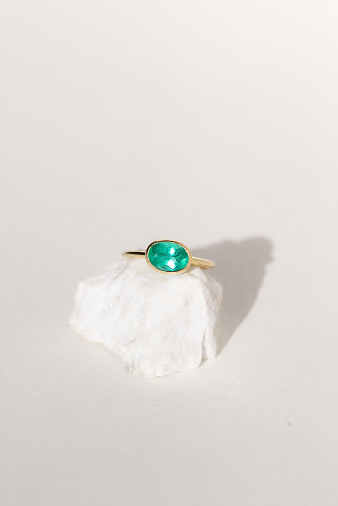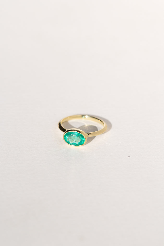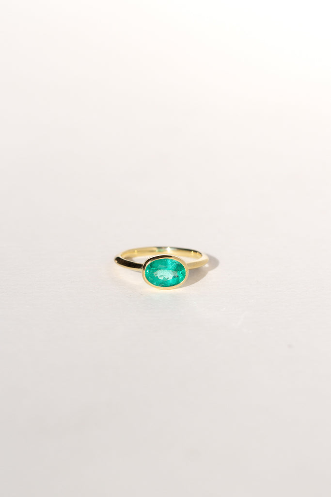 Anillo talla 10 EN STOCK. Anillo de esmeralda colombiana natural, calidad AAA, talla ovalada de 1 ct, 8x6 mm. Confeccionado en oro amarillo 18K con nuestra argolla duomo, fina y alta, para resaltar aún más la piedra. Peso aproximado 2,5 grs.