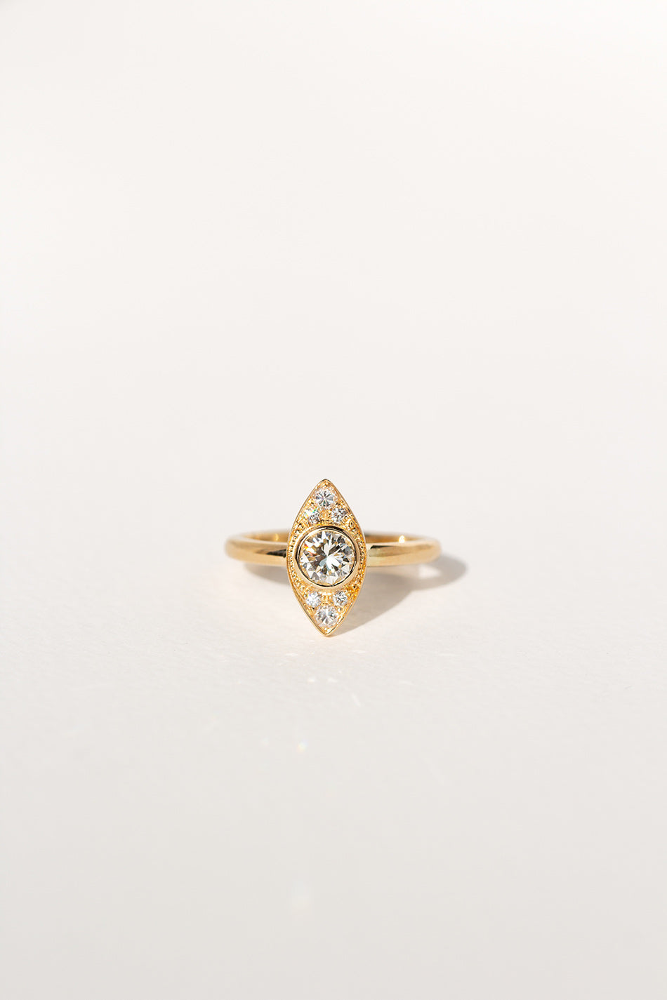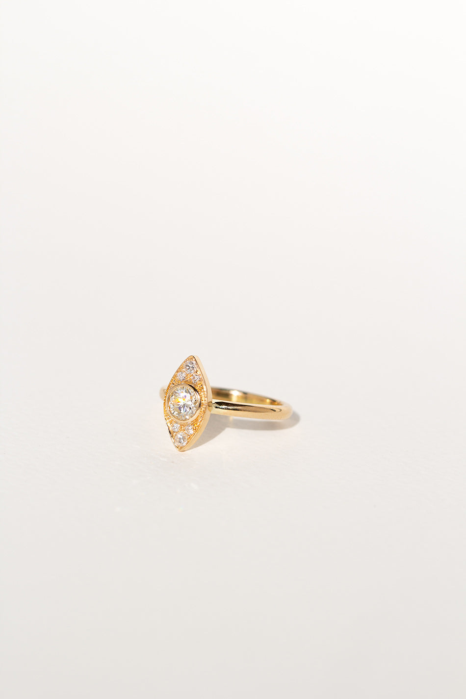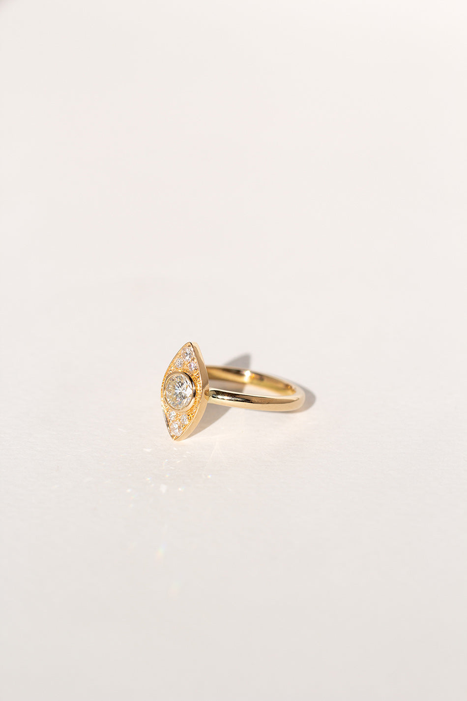 Nos inspiramos en un anillo tipo lanzadera vintage, para crear esta composición de diamantes que evoca una noche estrellada. Minimalista, romántico y lleno de historia. Perfecto para usar solo o combinar con otros anillos.